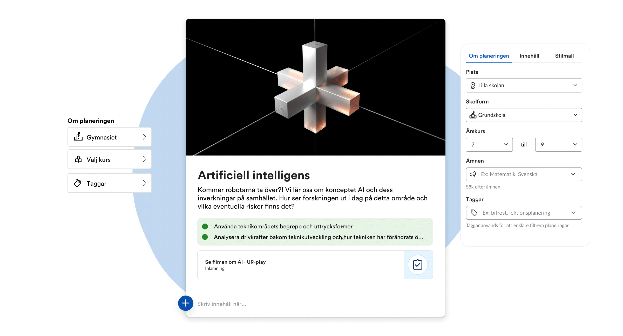 Att göra planeringar blir en helt ny upplevelse med det nya verktyget. Planeringar görs i sektioner, med en översikt av innehåll som uppgifter, läroplanspunkter, matriser i en egen kolumn. Nya funktioner är bland andra att du kan be verktyget föreslå läroplanspunkter att koppla planeringen till, möjlighet att redigera tilldelade planeringar direkt från undervisningsgrupp, ändra bakgrundsfärg i sektioner, och mycket mer.
